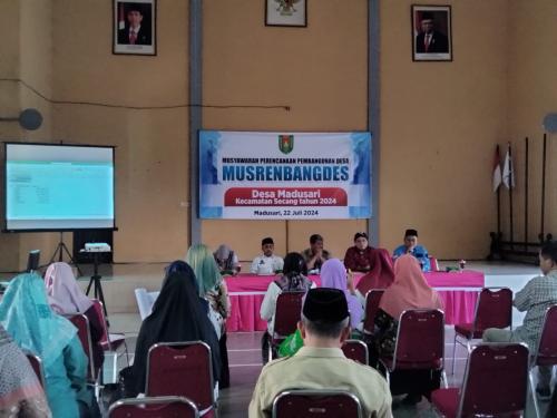 Pada tanggal 22 Juli 2024 di adakan Musyawarah perencanaan pembangunan Desa Madusari, Musyawarah ini dihadiri oleh unsur kelembagaan desa, BPD, dan Pemerintah Desa. Musrenbangdes ini adalah rangkaian dari proses Perencanaan di Desa dimana sebelumnya telah di adakan rembug stunting dan Pra Musrenbangdes pada hari Kamis, 18 Juli 2024. Sebagaimana dikatakan oleh Bapak Sularko Kasi Tata Pemerintahan Kecamatan secang yang hadir sebagai Tim Monitoring Musrenbangdes bahwa untuk menyusun APBDesa Desa harus membuat Rancangan Kerja Pembangunan Desa yang usulannya berasal dari RPJMDesa kemudian di musyawarahkan di Musrenbangdes. Bapak Kepala Desa Madusari, Bapak Sodikun dalam sambutannya mengatakan bahwa Musrenbangdes ini sebagai wadah penjaringan aspirasi dari seluruh masyarakat Desa Madusari, dan beliau mengharapkan perwakilan dari berbagai unsur ini bisa menyuarakan aspirasi masyarakat Desa Madusari, sehingga pembangunan di Desa Madusari benar benar tepat sasaran.